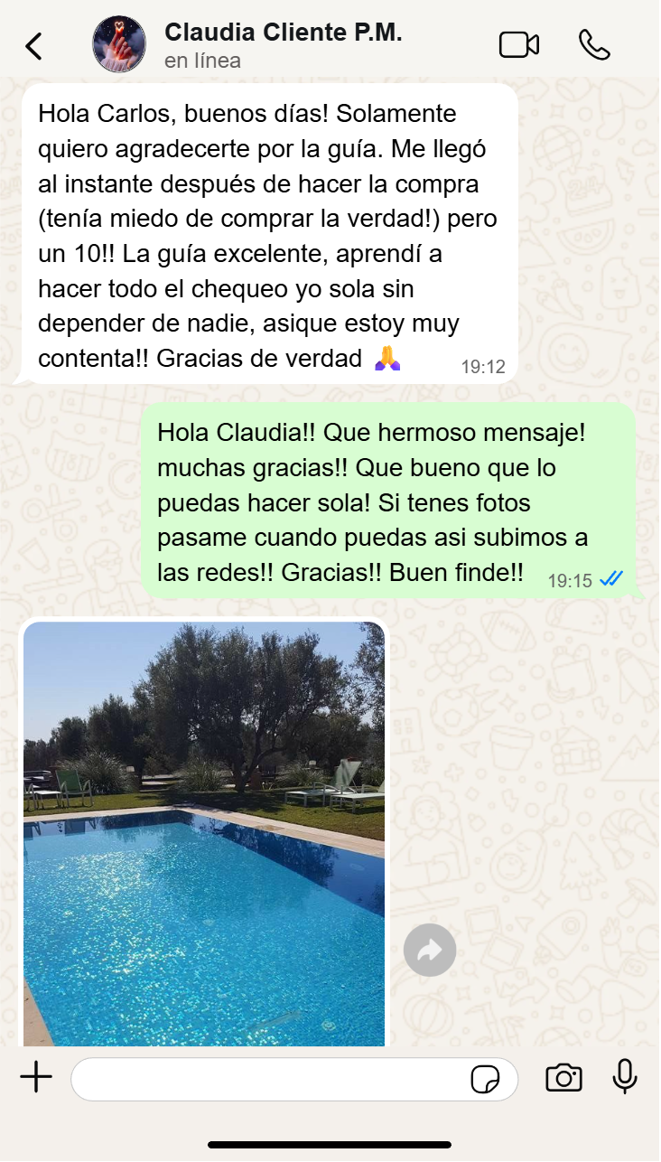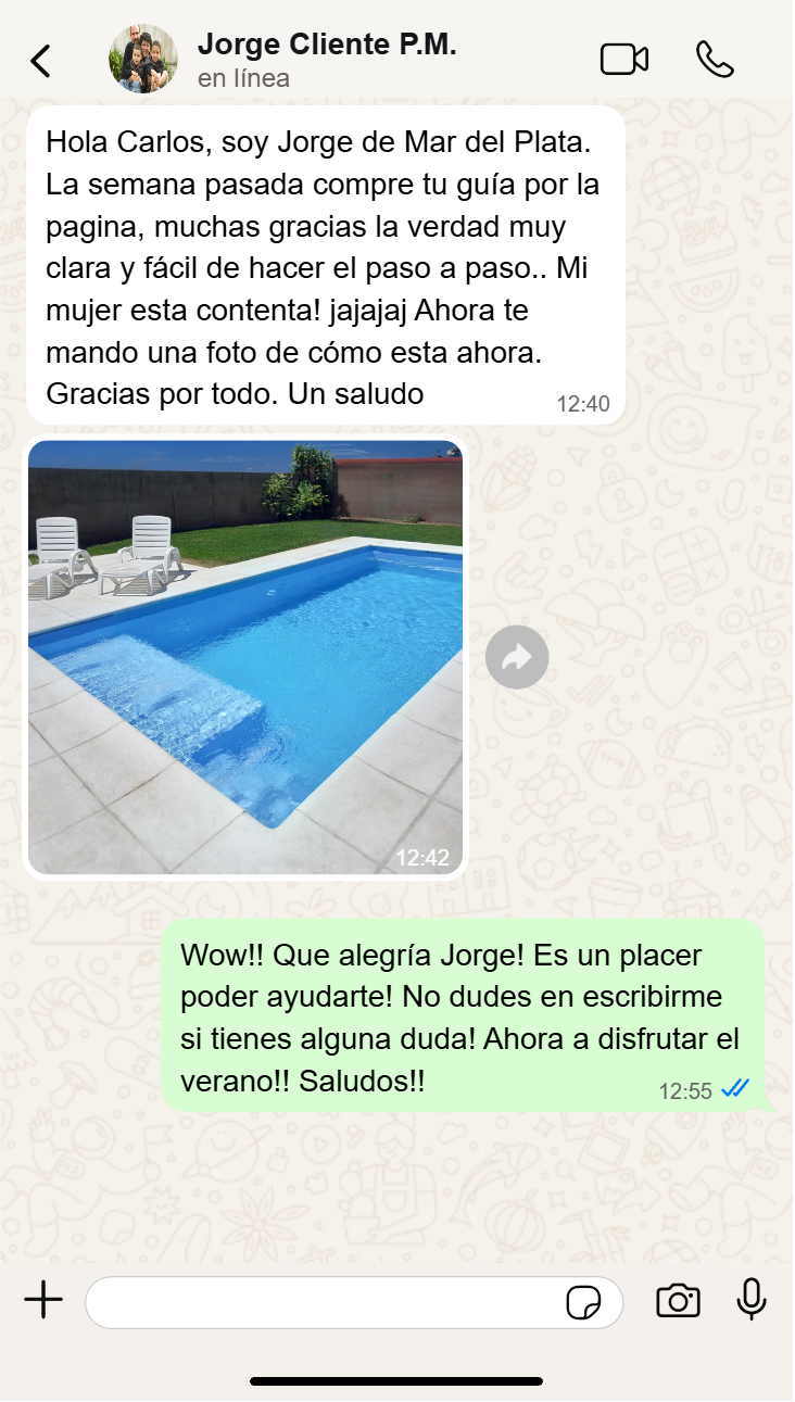 SUPER CLARO Y FÁCIL La guía super clara, te dan todo el paso a paso para alguien que no tiene conocimientos como yo. ahora me animo a mantener el agua y no tener que llamar a nadie..es muy facil todo!! Estoy feliiizzzz!! Gracias Carlos!! 🙏🏼